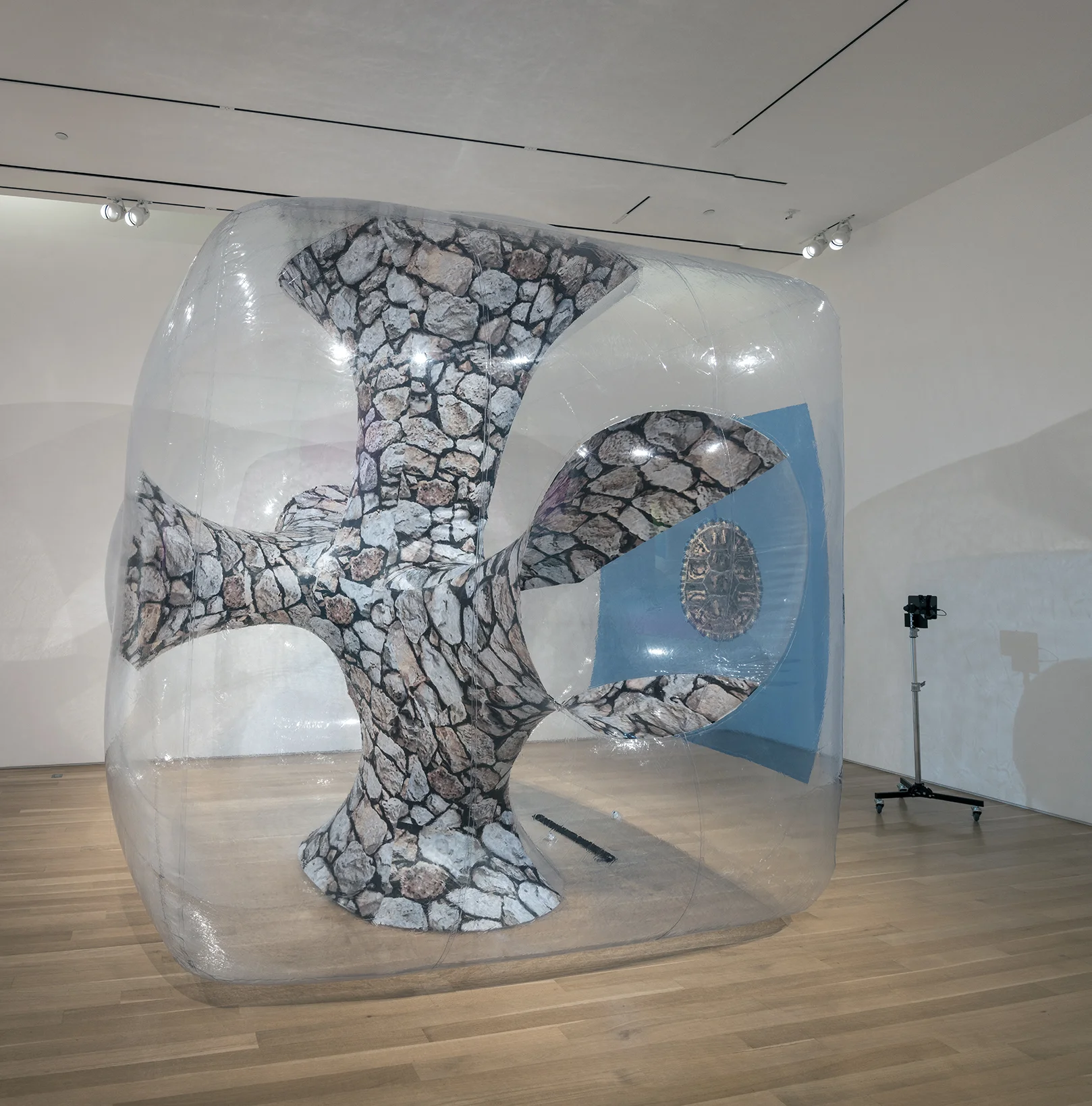 In Stoic thought, “pneuma” not only referred to “breath” but was considered to be the creative force, the vital spirit organizing both individual and universe. Like the cosmos of the Stoics, Rees’ artistic universe derives from breath but is held together by plastic and permeated by math. Conceived and modelled with 3-D software, each inflatable sculpture has emerged from a higher dimensional, mathematical terrain. In a Chinese factory, the object’s digital plasticity has then been translated into plastic reality. There is a strange similarity between Rees’ two preferred materials: the properties of code and vinyl, arguably a type of “soft” ware as well. Both are fragile substances, yet used to make enduring structures. They can be brittle, yet are infinitely malleable. They appear immaterial at times, yet their impacts can be both astonishingly and frighteningly material. Unconcerned by material contradictions, plastic and code can oscillate between states. They are the ‘pneumatopian’ material par excellence for they can be sculpted, modeled and molded into any imagined shape. It is thus not surprising that American post-war culture expressed its fantasies preferably in plastic or code.